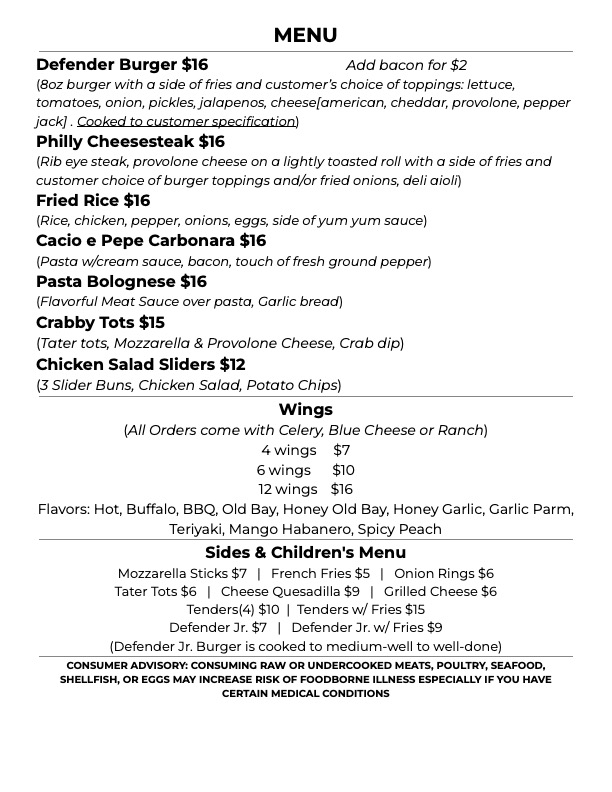 Sunday: Brunch & Wings menu (10AM - 2PM), meatball Subs (3PM - Close)